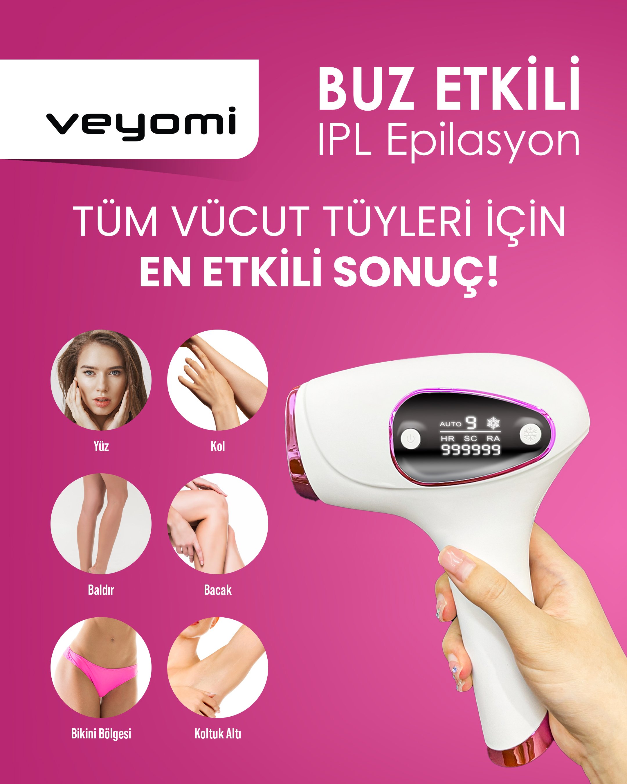 999.999 ışık atımı, buz soğutma teknolojisi, SC & HR modları ve 9 seviyeli IPL sistemle evde acısız epilasyon! Dokunmatik ekranlı Veyomi Y-1105 ile kalıcı pürüzsüzlük.